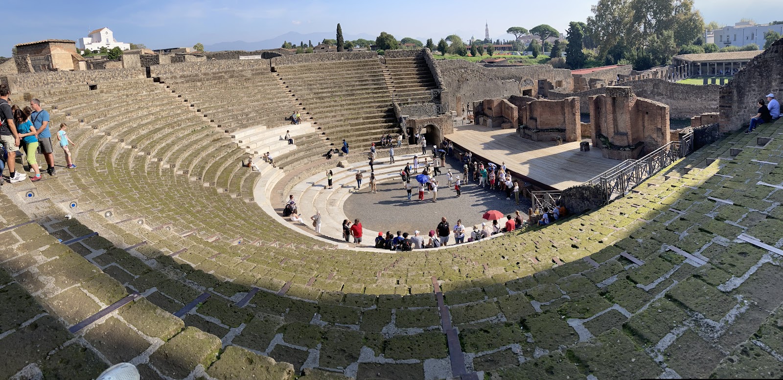 Der Innenraum ist grün bewachsen, aber im Außenring gibt es eine Ausstellung mit Fotos von "Pink Floyd in Pompeji".